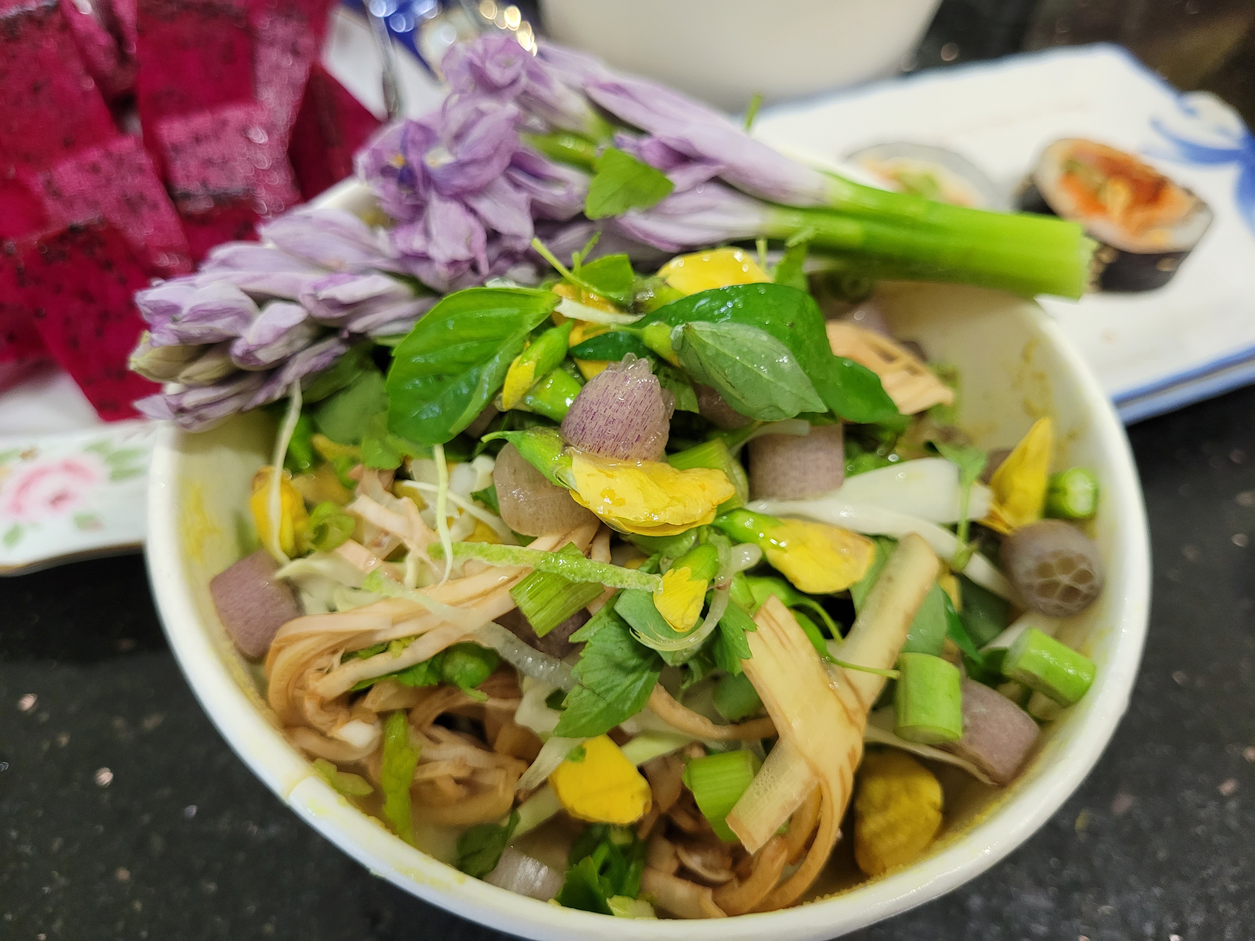 많은 야채와 꽃들을 쌀국수에 얹어서